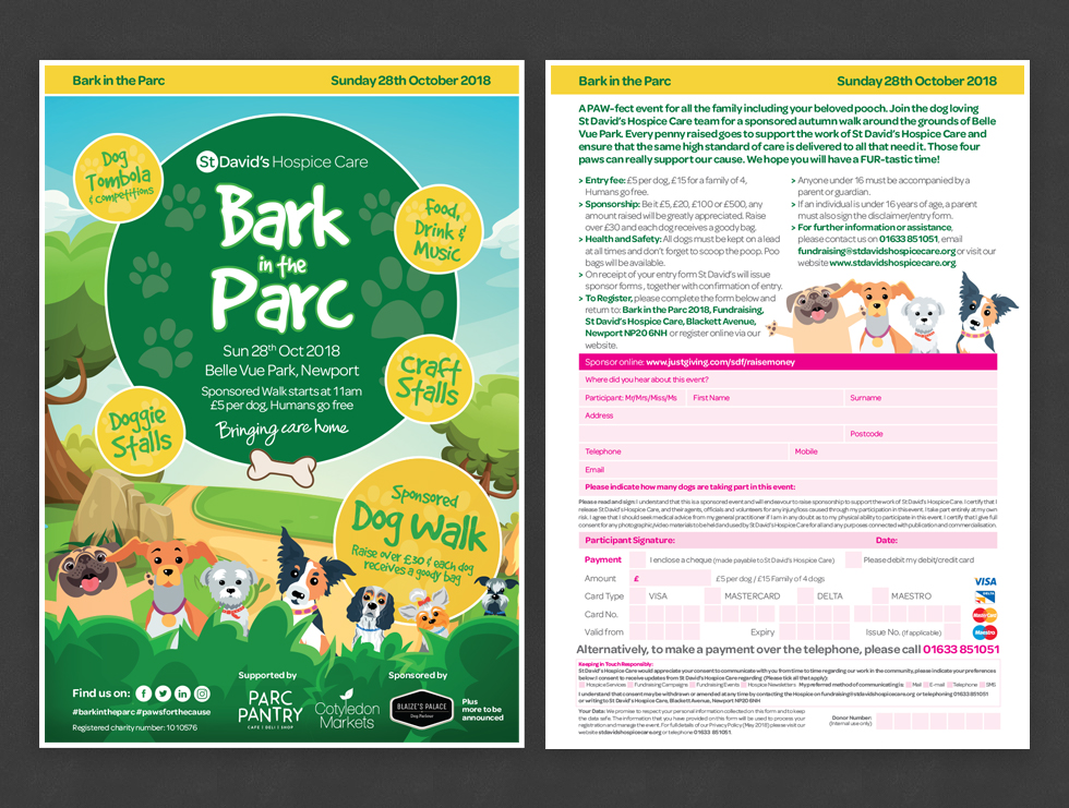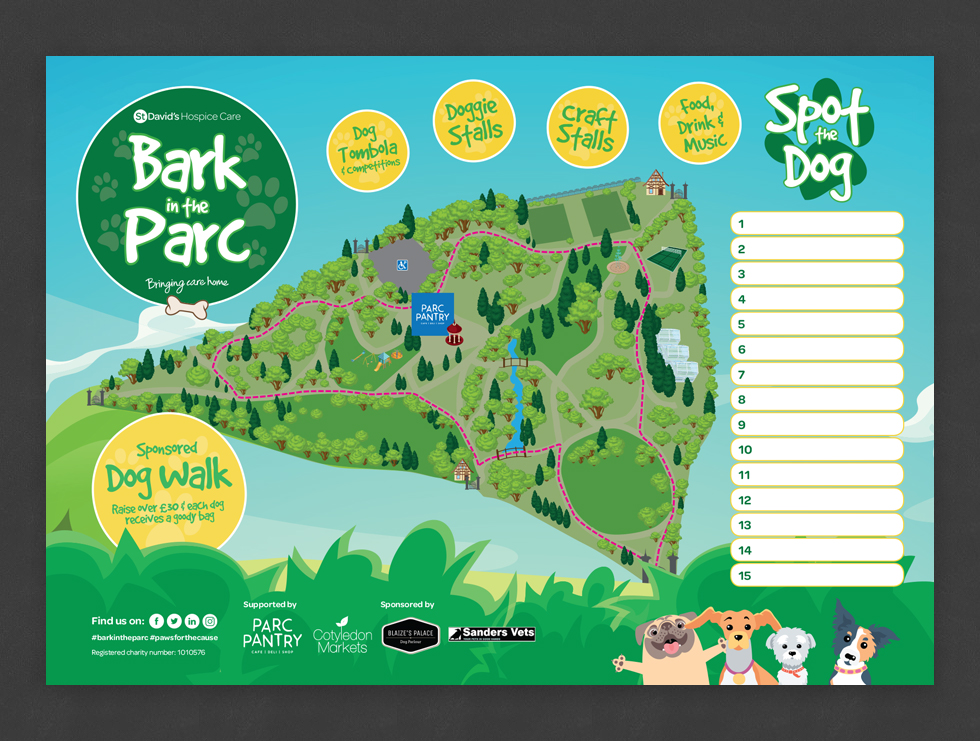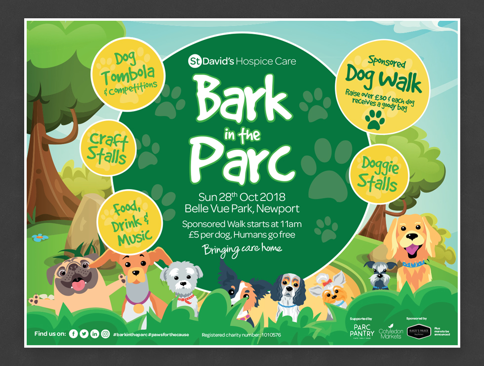 Bark in the Parc was a sponsored Dog walk fundraising event for St David’s set around the grounds of Belle Vue Park in Newport. I was responsible for the creation of the event branding, flyers, treasure maps, signage and collar flag designs.